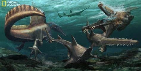 Y vaya casualidad, por aquella región, habitaban también un grupo de peces cercanos a los tiburones, los cuales mostraron en el registro fósil, marcas de dientes del espinosaurio.