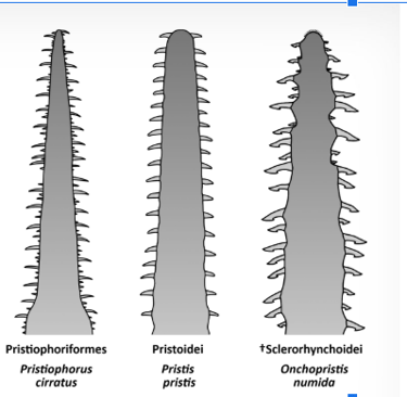 Sclerorhynchidos (es-cle-ro-rín-quidos=peces sierra extintos), prístidos (peces sierra actuales) y pristiophoridos (pris-ti-o-fóridos=tiburones sierra), son las tres familias de elasmobranquios que poseen una estructura alargada, conocida como ROSTRUM, la cual posee dientes a los laterales (Wueringer et al, 2009).